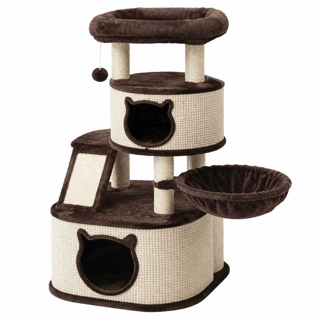 Árbol para gatos de tres niveles con felpa marrón y crema