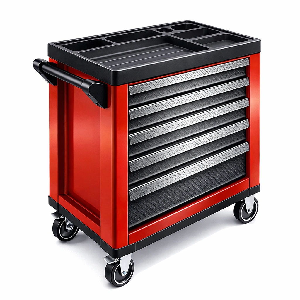 Carro de herramientas metálico rojo con 5 cajones y ruedas