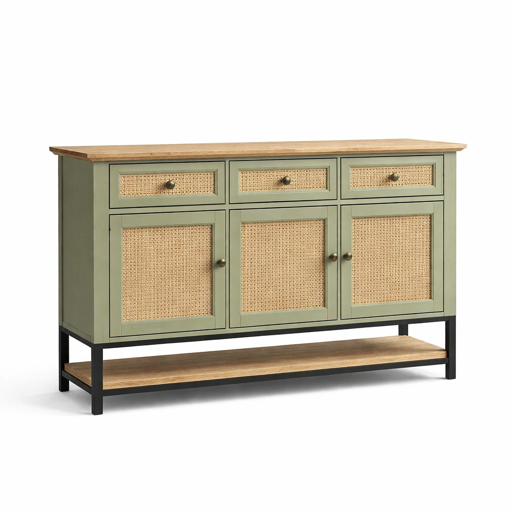 Aparador de madera y ratán verde con cajones y puertas