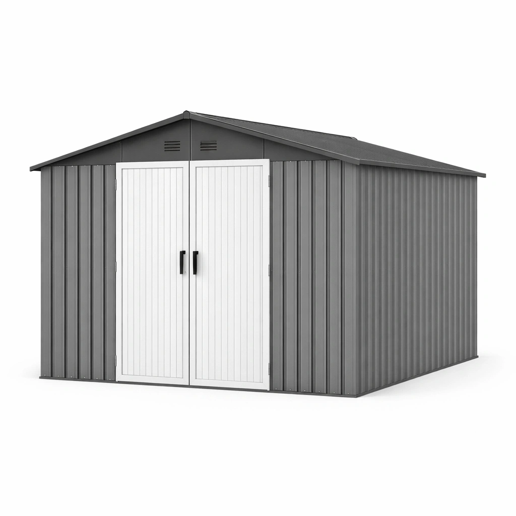 El cobertizo de jardín está fabricado en acero galvanizado. Tiene un diseño de techo a dos aguas con ventilación en la parte superior para mejorar la circulación del aire. Las dimensiones del cobertizo son 3.27m de largo, 2.57m de ancho y 2.12m de alto, con un peso total de 100kg. Presenta un color gris con detalles en blanco. Las puertas dobles ofrecen un acceso fácil.